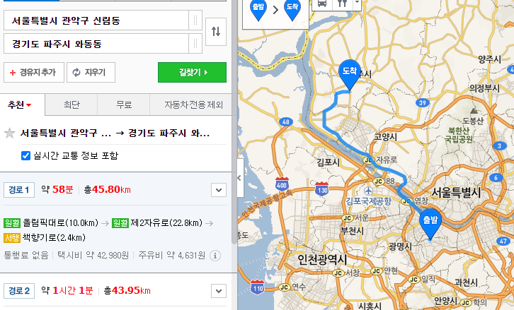 서울 관악구 신림동에서 경기도 파주시 와동동까지