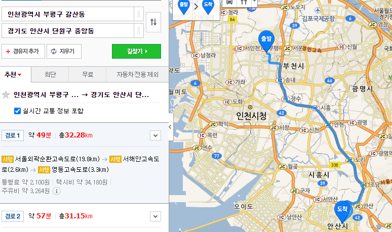 인천 부평구 갈산동에서 경기 안산시 단원구 중앙동까지